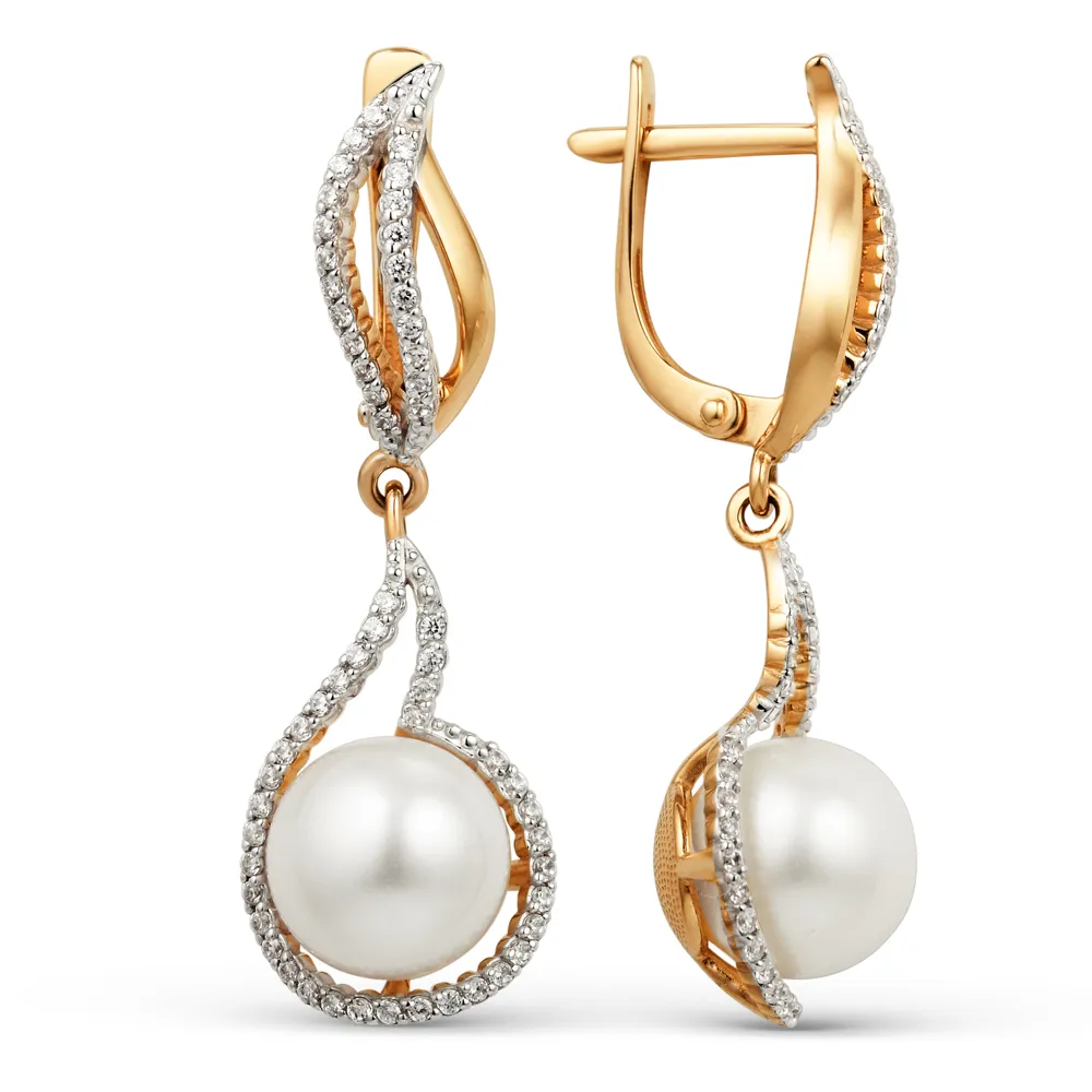 Серьги из красного золота с жемчугом и фианитами