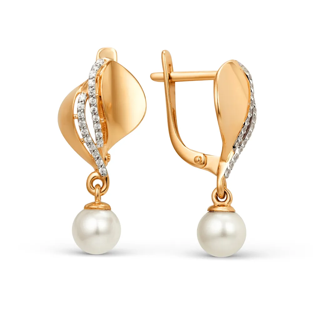 Серьги из красного золота с жемчугом и фианитами