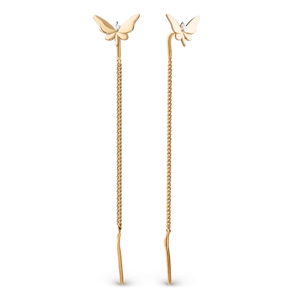 Серьги продевки из красного золота с фианитами