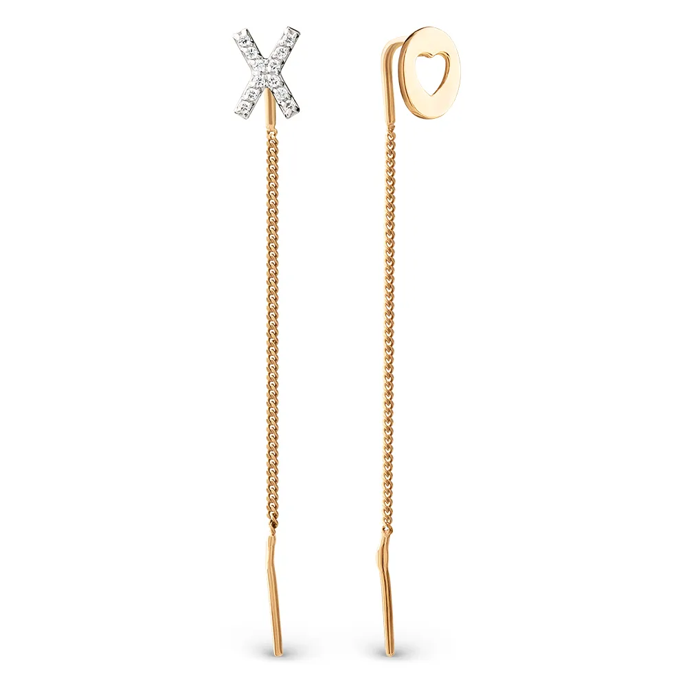 Серьги продевки из красного золота с фианитами