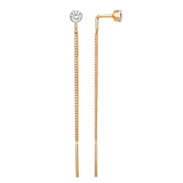 Серьги продевки из красного золота с фианитами