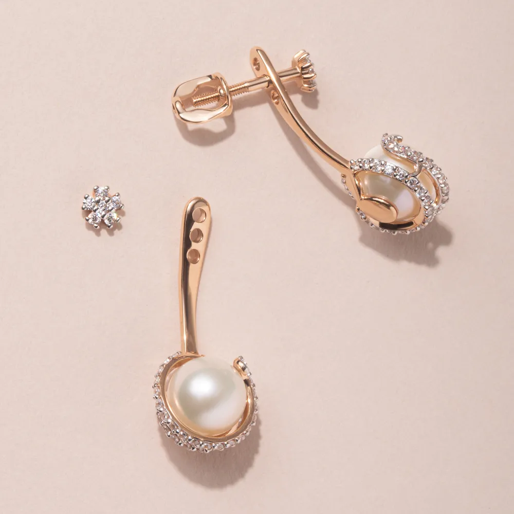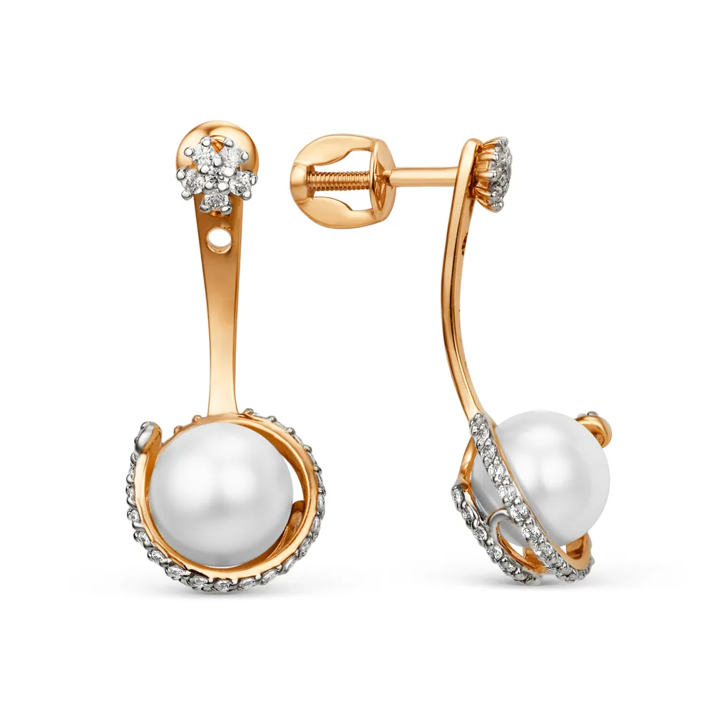 616261:337 Серьги пусеты из красного золота с жемчугом и фианитами Коллекция - Основная 0